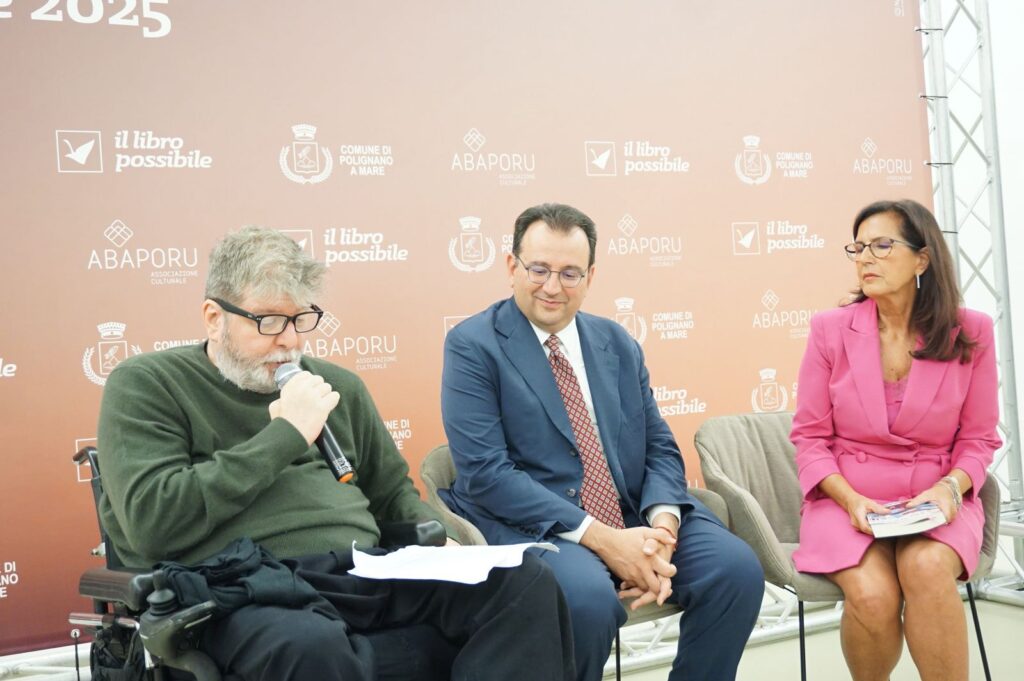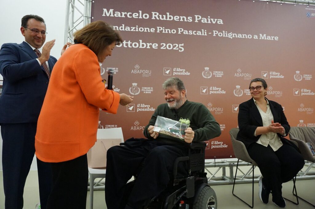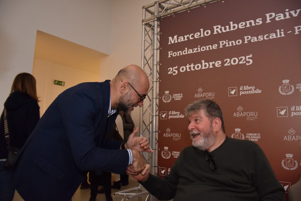 “Ciao ciao bambini”. Con una citazione di Domenico Modugno da parte di Marcelo Rubens Paiva è iniziato un evento eccezionale per il Bari Brasil Film Fest 2025, sabato 25 ottobre: una cerimonia organizzata, in collaborazione con “Il Libro Possibile” e l’Amministrazione Comunale di Polignano a Mare, presso il Museo Fondazione Pino Pascali. Marcelo Rubens Paiva con le sorelle Vera Silvia Facciolla Paiva – arrivata in Puglia con il marito George Avelino Fillho – e Ana Lucia Facciolla Paiva sono stati ospiti per la prima volta nella cittadina d’origine del nonno materno per un incontro all’insegna della commozione.